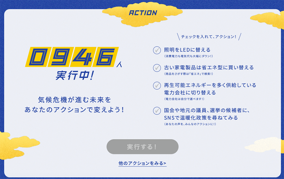 今できる行動をチェックして実行すると、現在何人が行動を起こしたかリアルタイムで表示される。