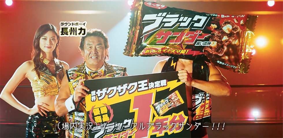 元プロレスラーの長州力さんを起用した、「ブラックサンダー」のリニューアルCM。